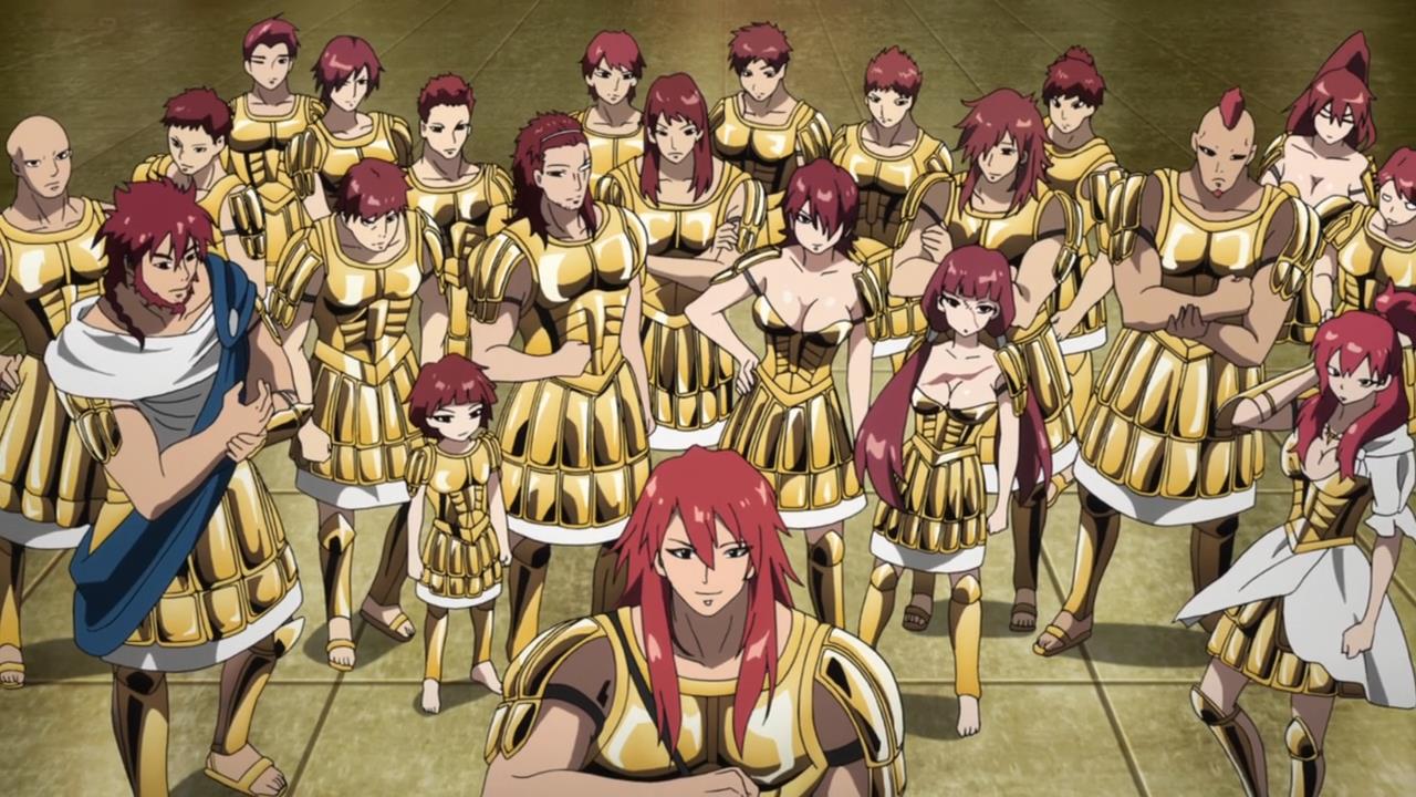 The war itself follows a typical shonen back-and-forth, the advantage only staying on one side long enough for the other to whip out their new technique. Magnostadt has giant barriers, but Laem has bombs, but Magnostadt has giant magic lasers, but Laem has the Fanalis Corps, but then Aladdin shows up… it could have gone on for even longer, as the manga features the ground soldiers wielding magic tools, but things are mercifully cut short to keep the story rolling. They did not, however, adjust the script: Mu still tells his squad to target magic tools, which (given the anime cut out the infantry’s flamethrower-spears) would logically refer to the artillery in the distance, but they then proceed to slaughter the foot troops.