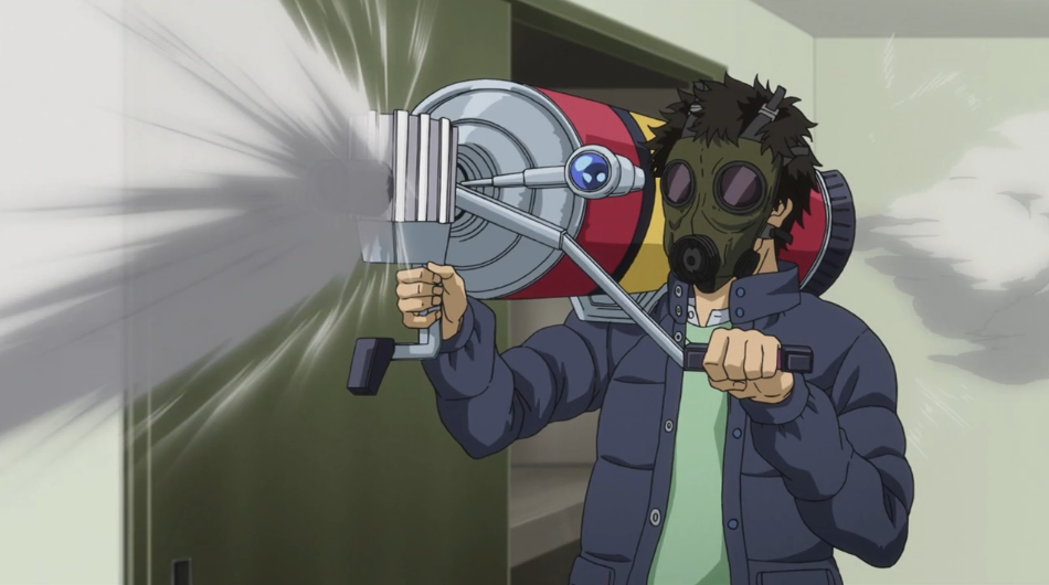 I suppose it’s a bit more excusable since Japan has some strict anti-gun laws, but you’d think the Secret Service of the Prime Minister of Japan would have some guns on them. Not that that would probably have mattered anyway, Every member of law enforcement outside Goto has been shown to have the dexterity of a three toed sloth, and thus give our heroes ample time to bring out each pose and weapon in their repertoire.