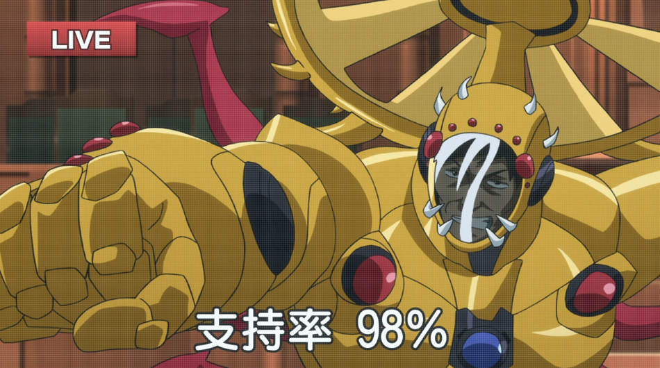 I… I… what… It’s like four months ago I got on a rollercoaster and at the halfway point it started its big fall, but it just never stops falling. We already had some idea of the Prime Minister being more than he appeared, but having past PMs’s portraits shoot light and form power armor… man I just wrote that down and it already doesn’t make any sense to me. I do love how unabashedly the power suit rips off Iron Man, replete with a digital HUD and central core. I loved the idea that the admiration of the people literally powers the robot vicariously. Clearly this is the kind of power that should have been use to solve our energy problems but no, Japan needs its armored minister division.