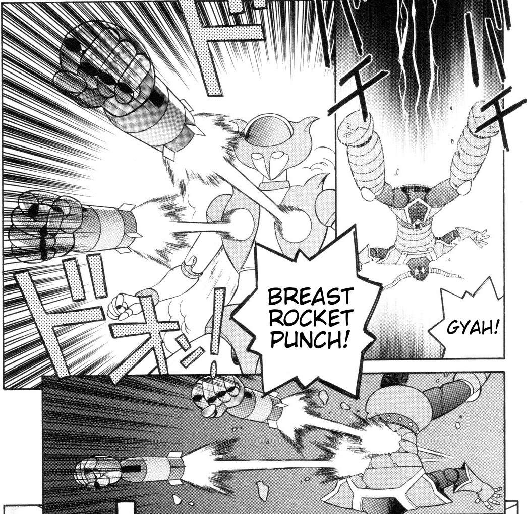 As the title implies, Mazinger Angels is inspired heavily by Charlie’s Angels, a famous 70s television show about three very bouncy ladies who were private investigators. Except this time the ladies are the female leads from different Mazinger shows, and they pilot giant fembots with various boob missile variants to protect the world from disaster! They are still, however, very bouncy. This is a Go Nagai manga, after all. It wouldn’t be Go Nagai without tons of utterly blatant fanservice. By the same token, it wouldn’t be Mazinger without lots of mecha battle action and Rocket Punches. As you might expect, this is taken to its logical conclusion.
