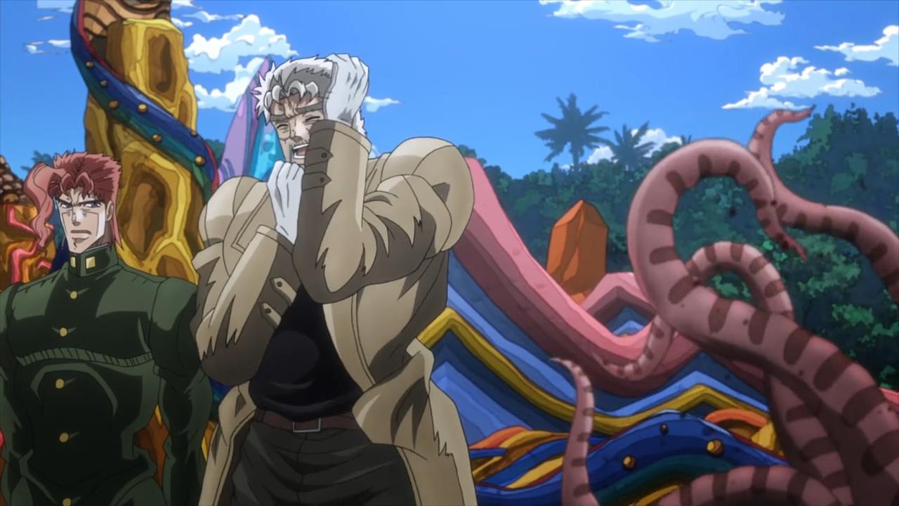 As expected, Avdol and Polnareff’s fight plays out in perfectly JoJo fashion, rife with expository descriptions, crazy poses, and ridiculous abilities. The crazy Frenchman and his badass stand has always been one of my favorite characters in Stardust Crusaders so it’s fun to see they get their proper dues. It is somewhat interesting that Polnareff ends up being both the character with the most dramatic backstory as well as the goofy comedy relief. I suppose it’s just an aspect of JoJo itself, to play gravitas and absurdity side by side.