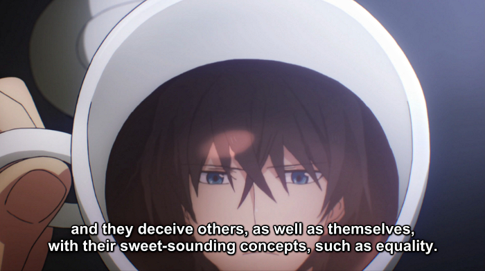 How does Tatsuya’s logic hold up when applied to our real world? I think that is the question anyone concerned about the moral of this story should be asking. I am reminded of arguments I’ve had with people over social justice issues on the internet. Those arguments are often obscured by unstated or ambiguous political beliefs. In episode 5 Tatsuya illustrated the lack of goals behind Mibu Sayaka’s call for equality. We know exactly what Tatsuya is talking about when he uses the word, but Mibu Sayaka? She has locked herself in an emotional struggle, tired of the discrimination she faces. Her only goal is to get rid of the awful feelings that come with having an institution of people look down on you, something anyone with human feelings would understand. The problem is that in the end what she is calling for relies on the student council to provide answers. She has none herself. Trying to change the world without a clear vision of what you want to see happen is poisonous logic at best. It’s a loose cannon of emotions at worst.