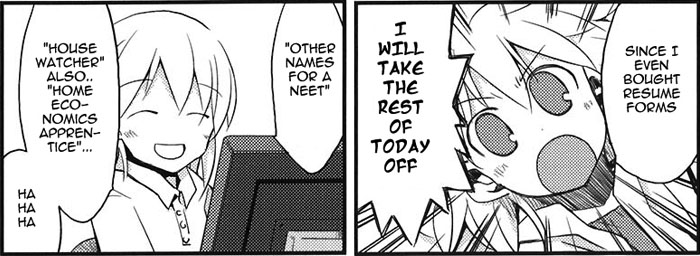 I suppose my biggest complaint is that the manga feels quite restrained. It doesn’t ever go near the levels of insanity that Welcome to the NHK boasts, and it isn’t forcing laughs as frequently as I’d have liked. That said, it does have a Hidamari Sketch vibe to it, so if you enjoy a slow-paced slice-of-life, this might be right up your alley. In fact, Kanae is quite similar to Hidamari‘s Miyako, if you swap the obsession with food for a fear of being employed. Okay, perhaps they’re not so similar, I’m going to continue pretending this is a Miyako side-story because it’s more fun that way.