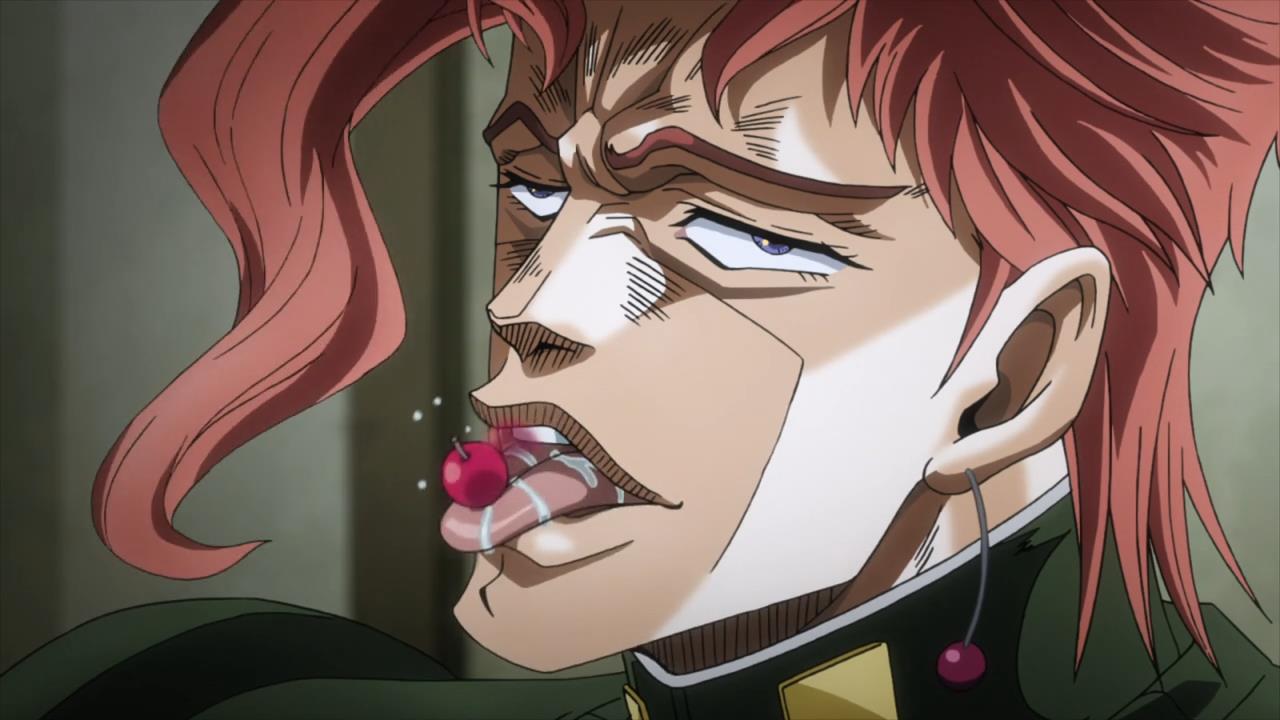 Not much to say about the first episode. It’s cool seeing our characters show off their stuff, even if it seems clear that their opponents seem to care more about flaunting their abilities than actually killing any of them considering all the time Devo had to do the job. This is getting increasingly hard to believe considering every single assassin has talked about how no assassin overuses his Stand so that people can’t tell it’s weakness. Then the next episode happened. Just… That stupid noise Kakyouin makes when eating a cherry… what the hell guys?
