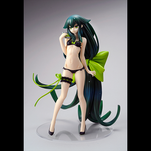 Timmy: There are a fare amount of interesting things going on here, though how much you are going to appreciate them depends on how much you mind the fact this girl is in noting but her skimpy unmentionables. The thing that really stands out for me though is her green color scheme, how her hair is all dark green and there are splashes of lime green in her ribbons and eyes. And all this against her skin tones of course. I think its a neat composition. Sculpt is alright, though they could have split the hair up a bit more to avoid it resembling noodles. Face shines though, as its a look I would expect of someone not giving a crap about being mostly naked. A pretty unique and interesting figure with all that color, though in the end she is still going to cost an arm and a leg.