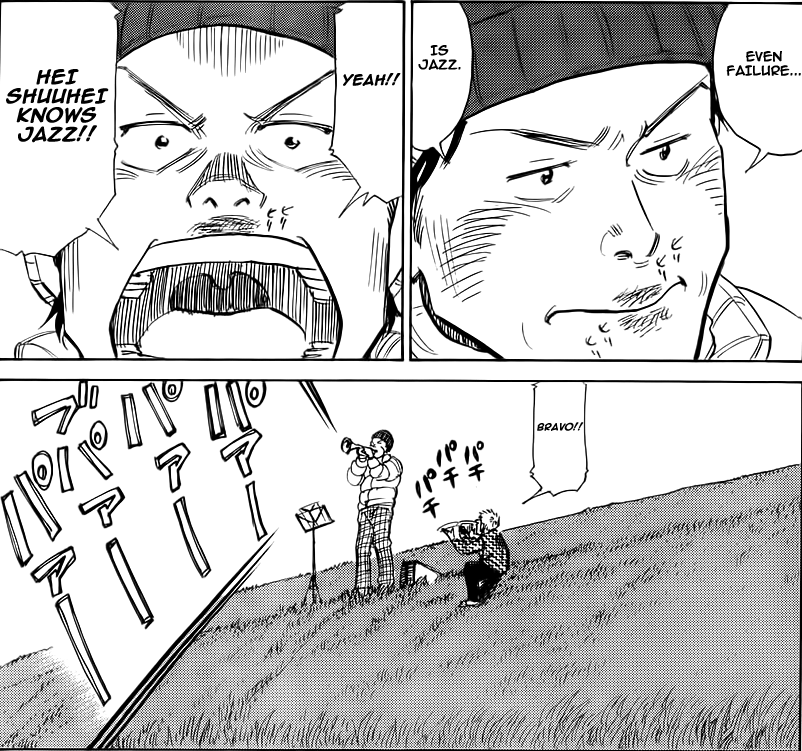 Straight no Chaser reminds me of Rock ‘n Roll Ricky in a lot of ways, as they have very similar tones (no music pun intended). Both are about a fairly washed-up guy finally trying to make something of himself, even if the reasons vary. It’s very refreshing to see Shuuhei pick up the trumpet and proceed to completely suck at it, and to watch his journey as he learns about jazz and comes to understand the freedom in doing something simply because you enjoy it, not because you’re trying to impress people. It’s a lesson that I still need to learn, myself.
