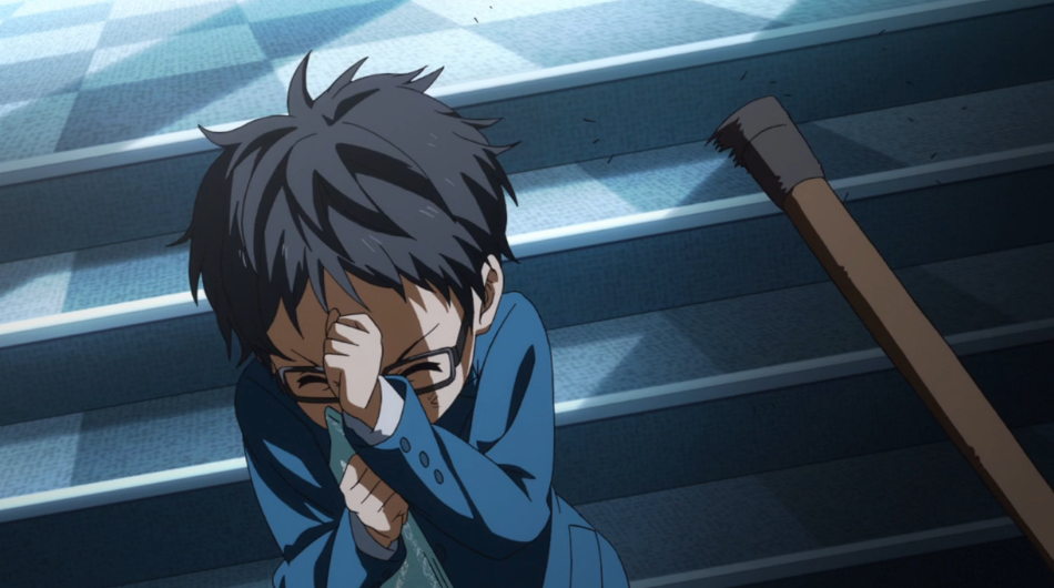 I’m calling some major BS on our Kousei drama bomb of the month. We’ve seen multiple examples of Kousei’s mother getting rid or making him not do any type of activity that could injure his hands. It makes a lot of sense that she would be paranoid about this. It’s for this reason that I find it absolutely ridiculous that, even as an abusive parent, she would herself strike his arms. She knows how much damage could be done from a single broken bone. I’m not saying she is perfectly logical in all her actions, but if her attempt is to beat obedience and make him play perfectly, having her injure the very arms she means to exploit is the height of ludicrousness. She obviously is not completely together, but her single minded goal does seem to guide her behaviors in a twisted way. I’m also finding it a bit hart to take in that he tells her to die and the shows like AND THEN SHE DIED. In the beginning, emotions about his drama were better handled, everything this episode was like a heavy hand to the face.