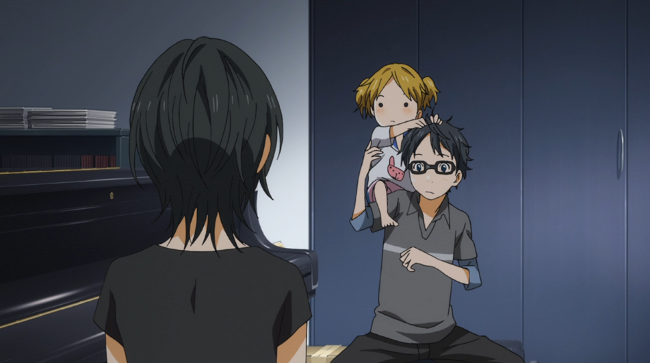 So my fears are somewhat assuaged by the new character, as at least Hiroko does have some relevance to Kousei’s past. Unfortunately, while that fear is gone a new sense of moves in its place. Are we really to expect that this woman actually cares about Kousei? Not only does it seem to be implied that she knew about his abuse and did nothing, it seems apparent that she has had absolutely no contact with him since his mother died. How are we supposed to believe any supposed care for Kousei when she didn’t even bother to stay in his life? Are we going to get some kind of sappy revelation that she felt ashamed for encouraging his growth as a pianist? The more I think about the implications of this new character the more I don’t like where this is headed.