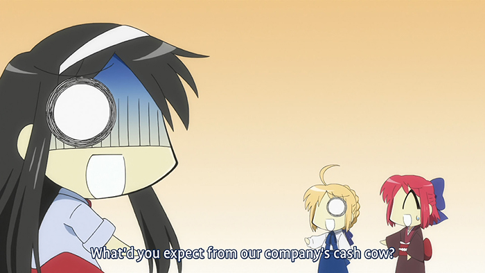 Iro: I’m sick of Type-Moon’s ridiculous merchandise machine churning out stuff like this (for reference, this is a character from a spin-off light novel that was based on a cancelled MMO spinoff [which is now being recycled into a mobile game spinoff], whose character design is based off a cameo in the DEEEEEEEEN anime), but I’ve come to realize this is what lets the actual show have so much goddamn money to burn. As such, I feel like I’m not allowed to complain.