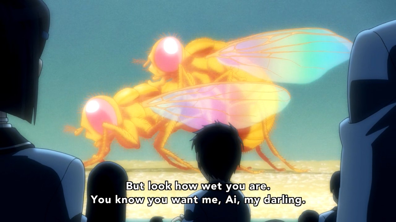 By the end of the episode, Sex Batman and Shit Protag have together organised an attack in which a school assembly is interrupted with footage of two flies having sex, while Sex Batman offers graphic and enthusiastic voice-over. Of course, being shocked by the very existence of ‘lasciviousness’, the student body is confused and not sure what to do with this somehow new sensation brought on by the footage. A victory for awareness!