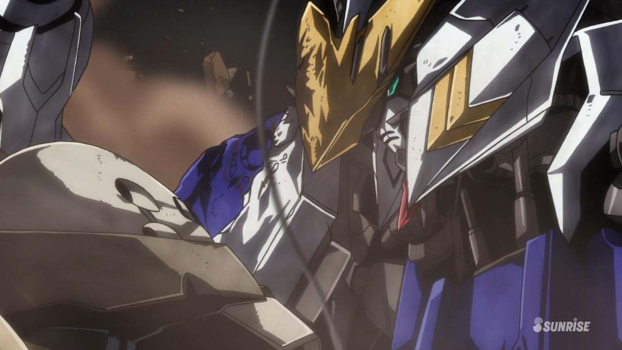 These are obvious storytelling basics, but stories tend to be more engaging when the heroes are actually in trouble and not just trouncing everything in their path. IBO has been building up the sense that at some point everything’s going to go to hell for Orga, but it’s impossible to tell if the scriptwriters are smart enough to actually deliver on that. As for Mikazuki, having him get helplessly dragged around by Lafter’s Hyakuri works because it’s a legitimate disadvantage he has to overcome with wits and gumption; having Barbatos be slowed down feels cheap because it barely got scratched while fighting four Mobile Suits in episode 5. It’s particularly noticeable since Barbatos gets fucked up this week, even losing half of the iconic Gundam v-fins. Still, if the plotting and pacing of IBO can stay at the standard this week set, then it might just cause my feelings on the show to turn around.