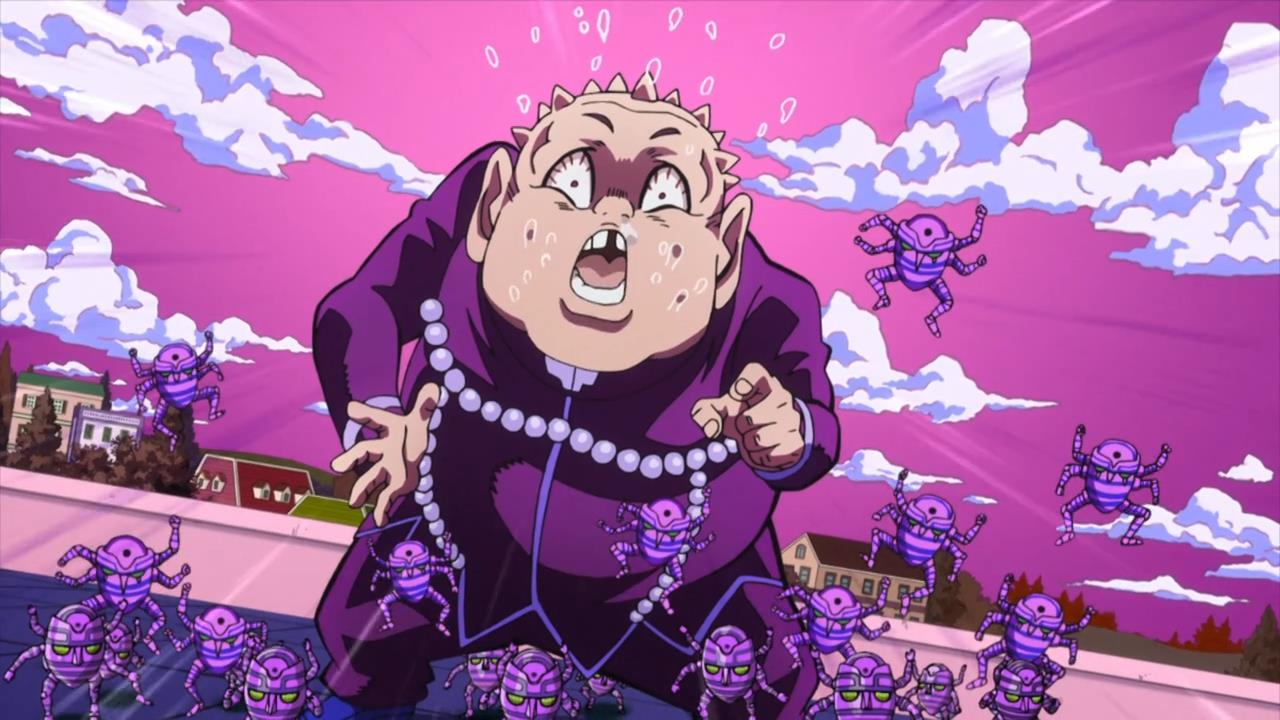 As is generally the theme with JoJo and its pretty-much-directly-on-the-nose episode titles, with this pair of episodes we meet Shigechi, a portly middle-school student with a Stand of his own. Harvest Harvest is similar to Worse Bad Company in that it’s made up of dozens of small units, but it has a secondary purpose of laying slightly more groundwork for the rules of how Stands work. In Stardust Crusaders, it was established that the more powerful a Stand is, the shorter its range, and (barring Red Hot Chili Pepper’s ability to manipulate power lines) that rule has stayed mostly consistent. For example, Echoes ACT 2 – with its greater abilities – has a shorter active range than ACT 1. Harvest, while not terribly “strong”, has a much bigger range than basically any Stand we’ve seen so far; the rationale here is that while acting at a long range, it can only follow the most basic of commands. We’ll see a bit more of this type of Stand pretty soon, and it shows up again in Part 5.