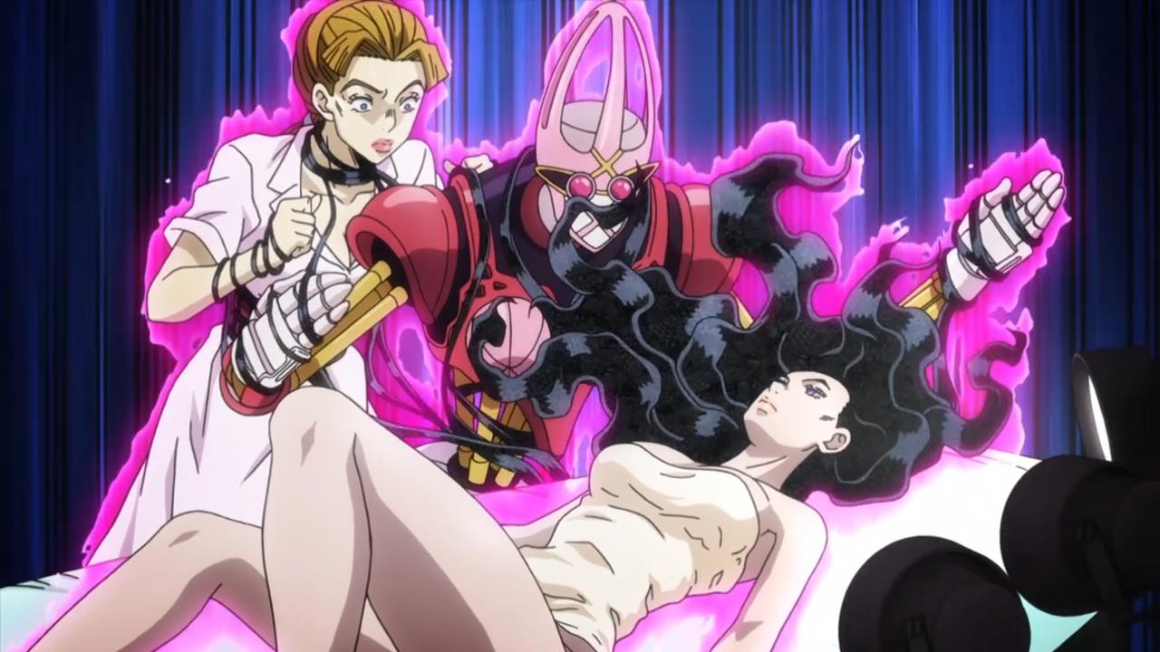 Our new Stand-user this week is Aya Tsuji, who is yet another on the list of people using their Stand for personal (relatively benevolent) financial gain. When your amazing psychic powers manifest as the ability to change people’s physical appearances, what better career is there than a beautician? It’s a great excuse for Araki to draw more creepy body horror stuff a-la Heaven’s Door, with Cinderella cutting off face chunks as part of its procedure. It is also a great excuse for the anime staff to go as shoujo as possible for a show like JoJo, with intricate, stained glass style splash shots popping up at every opportunity and plenty of blushing, love bubbles, et cetera. On the other hand, it means we get awkward fanservice shots of Yukako and Aya, which are worth nothing more than a roll of the eyes. Araki’s style is not great for drawing cute girls, and especially not in scandalous poses.