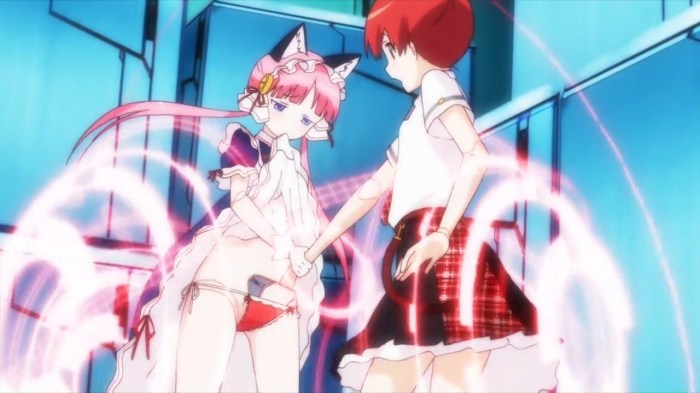 Criticism is a strange thing. Most of the time, a critic won’t just hate something because its quantifiable properties are lacking in comparison to other works within its medium or genre. As our dislike for Aldnoah.Zero shows, personal pet peeves or disappointment may play a role as well, amplifying its flaws and completely blotting out whatever redeeming value the work may actually have. Pandora in the Crimson Shell, on the other hand, is just objectively awful. With its loud, non-sequitur humour, plethora of silly faces and all-in pandering to the ridiculous fetishes of yesteryear (Maids! Catgirls! Playboy bunnies! Transhumanism!), feels like a blast from a past no one is nostalgic for, garish colours and godawful character designs included. Yet the most dated thing about it is that Pandora in the Crimson Shell seems to have completely missed the memo that it’s totally fine for anime to be blatantly sleazy now. The ludicrous explanation this show carts out to justify why it forces viewers to watch two tween robots fingering each other is utterly pathetic, and it ends up even more disturbing as a result. While most modern anime at least have the dignity to wear their skeeze with pride, Pandora in the Crimson Shell frames its disturbing fantasies entirely within the innocence and idiocy of a wacky action comedy that could be believably edited down to appeal to 8-year-olds. It’s an episode of Hidamari Sketch with two minutes of snuff film spliced in. That is, if Hidamari Sketch had all the charm of a bed bug, all the artistic vision of a piece of driftwood and an animation budget in the single digits.