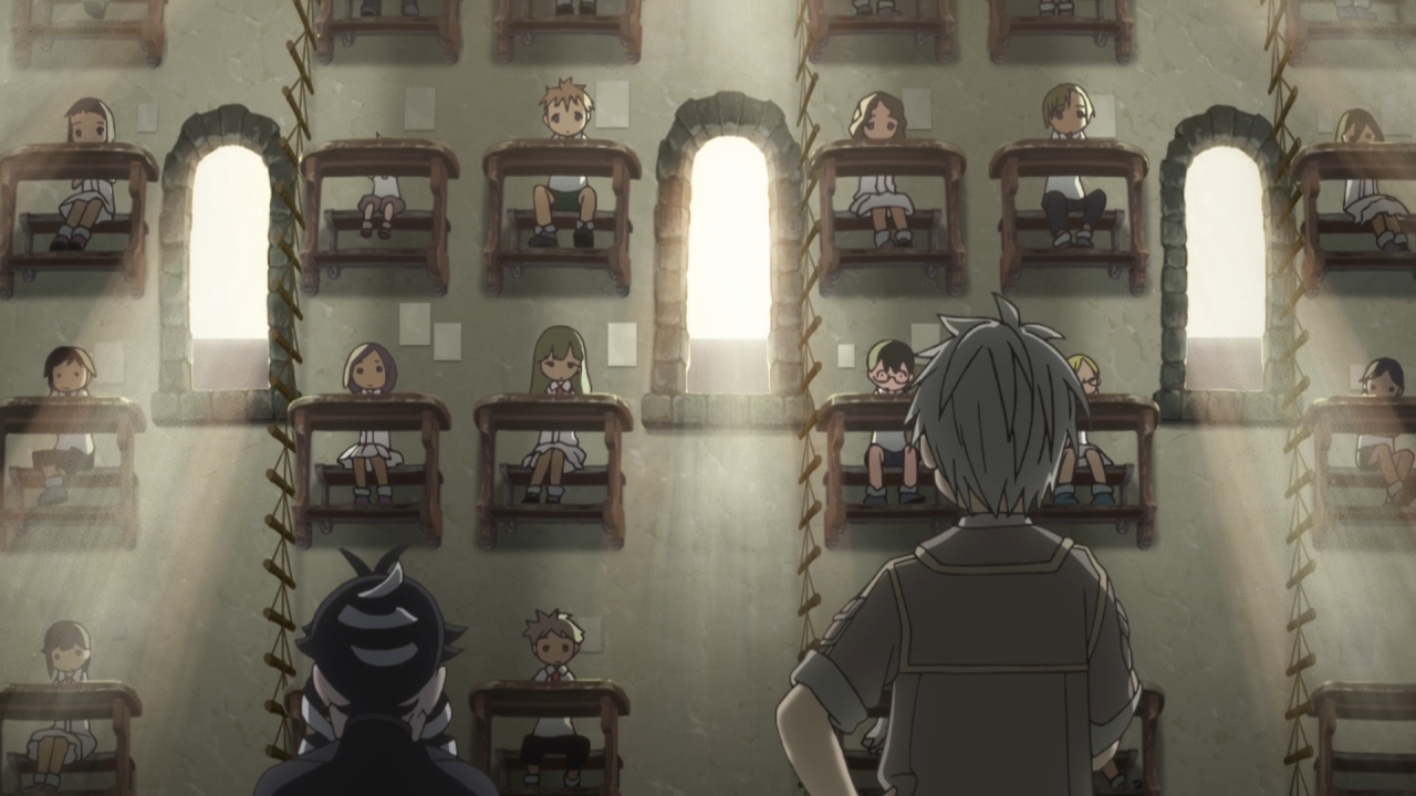 Even the fact that the character designs look like they’re nearly all permanently stuck in chibi mode couldn’t put me off the writing, which is serious enough thanks to the setting but not lacking in small, charming moments of humour which, refreshingly, aren’t based on normal anime clichés and aren’t over-exaggerated or dragged out for too long. The story is neatly told without the use of much exposition (save for the small chunk of narration at the end, which I felt wasn’t even really necessary), and the cast so far is lively and interesting. Again, the character designs do make me question how old these guys are meant to be – the main kids look certainly no older than 10, if even that, and Leader about 15. That said, if they are meant to be around that age then it works as a pretty great yet subtle reinforcement of exactly the kind of world these people are living in, if young child orphans have to be “Cave Raiders” and basically act like capable and resourceful adults in order for them/their society to live and thrive.