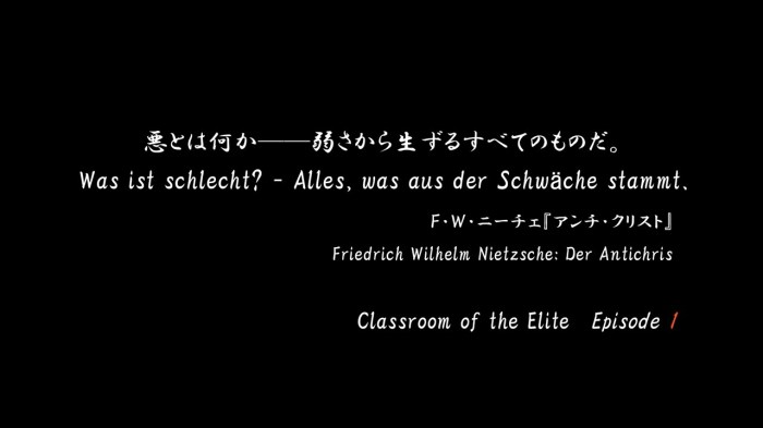 None of those questions are really asked in this episode, in fact I’m not too clear what Classroom of the Elite is trying to say. The politics presented do feel like the author just discovered Ayn Rand for the first time with its merit based reward system and obvious digs at the unwashed masses’ inclination toward wastefulness. But are they saying those things are good or bad?