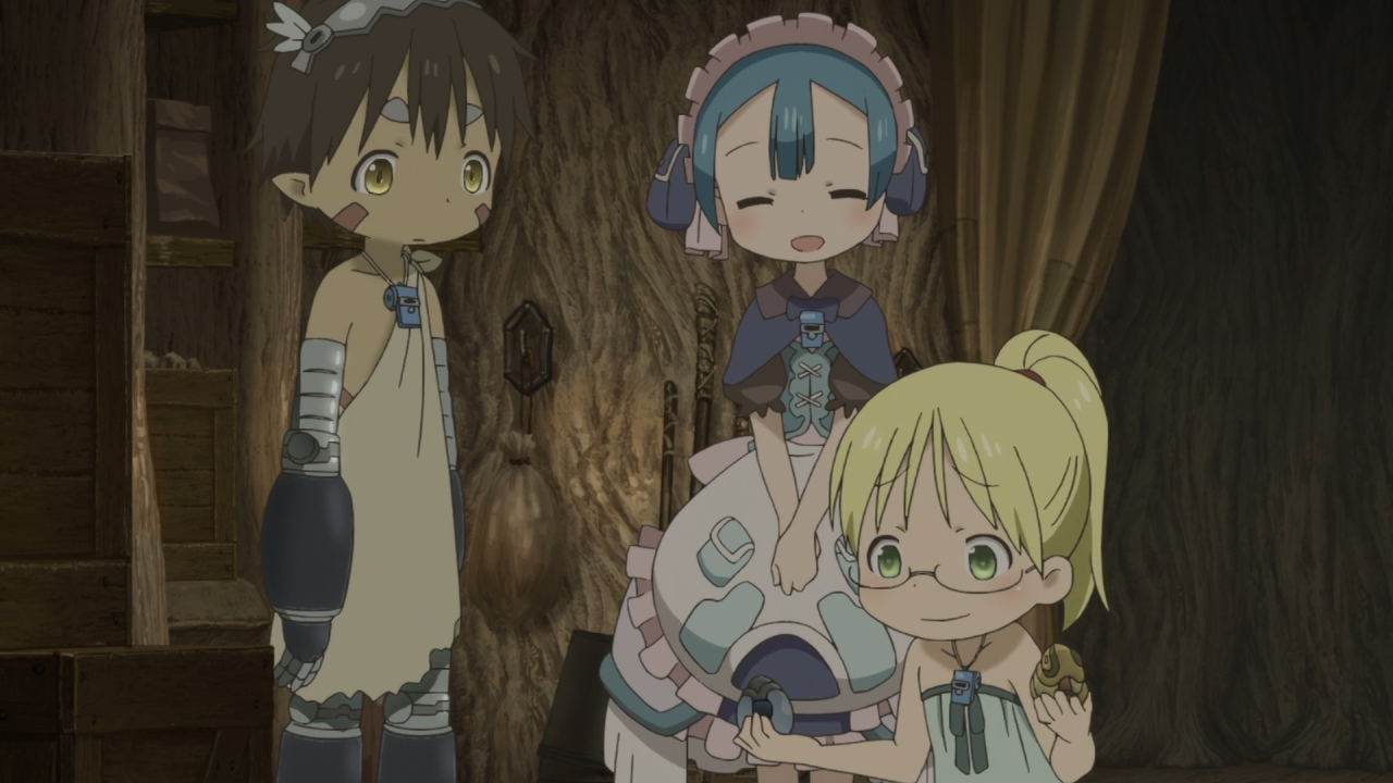 The centrepiece of the Ozen arc is of course the revelation that Riko isn’t exactly what you’d call alive, and the Relic used to carry her actually got her up and walking and talking. This is obviously a pretty cool revelation, but I think the way it’s presented deserves some attention also. While Riko is suitably shocked, they don’t grind the plot to a halt for multiple episodes in the way you might expect. Instead, the action and characterisation continue moving and the twist is further played out through Ozen’s flashbacks to her time with Lyza. I like this a lot because it means we continue to get stuff actually happen in the story, while giving the long-term implications of the twist time to settle and contextualising it within more character development, chiefly of the up-til-now absent Lyza.
