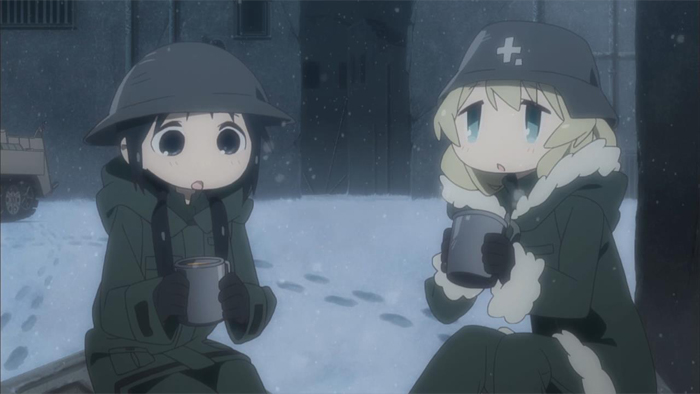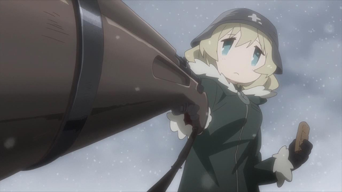So I guess this is officially A Thing now, creating shows like this one and Made in Abyss where you take a couple of sweet, cheerful child characters and drop them in the middle of a terrible setting for juxtaposition. And you know what, that unsettling disconnect between bright, upbeat kids and dark, perilous surroundings is actually something I feel I can get behind – though it’s probably worth a note that it really only ‘works’ because that disconnect is considered perfectly normal for the world it’s in, and therefore goes largely unspoken by any of the characters. The fact that there are two small girls wandering around alone in the middle of (nuclear?) winter, with guns and broken planes littering the countryside, isn’t presented as a big deal here because as far as the characters are concerned, it really isn’t. Other things help add to the mood without any need for clumsy exposition or even a whole lot of dialogue, such as the weapons seen by the girls as vaguely mysterious relics of the past, abandoned debris of a war fought long ago by people and for a reason they aren’t actually aware of, or being able to read the word ‘chocolate’ but not actually knowing what that means. I’m not sure I’m quite used to these extreme chibi-esque character designs yet, and I sure do hope that we manage to avoid any kind of creepiness in the nudity/sexual department for a change, but based on the premiere alone, I’d say it’s looking pretty good so far.