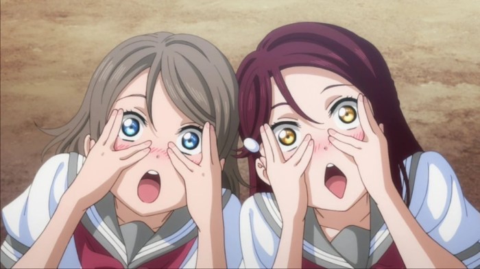Don’t call it a comeback, because this marketing machine never once stopped running. Like a rival from a bad shounen anime, Love Live! Sunshine!! first taunted me, then appeared to open up only to mercilessly stab me in the back when I least needed it to. Now, more then a year later, the blight is upon me once again, and out for vengeance. Vengeance for what, exactly, you may ask? I dunno, for calling it “a tepid, manufactured Big Lie which just happens to be told by some very talented people”, maybe? Truth be told, judging by this opening episode, I’m not even sure if the last part of that statement even applies anymore.