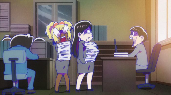 Jel: Short segments this week but still a solid episode. Karamatsu-centric bits are probably my second favorite after Jyushi, and this one was pretty good. I dont know if he intentionally set up Choro the way he did but it sure does look that way. Totoko at the office brought back flashbacks of a terrible former co-worker that I begged my boss not to hire but he did anyway. Yes, people can be that bad at their job. The best of the three segments this week as the last one, bringing us back to the “meta” versions of the Matsunos who are super rich and famous after the success of season 1. It wasn’t as good as the first episode, but just weird and self deprecating enough to be good.