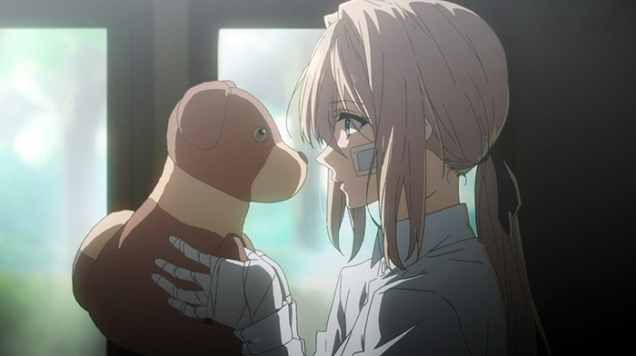 Still recovering from her injuries during the war, Violet is taken in by a former commanding officer who gives her a job working at his delivery business. It’s there she meets the Auto Memory Dolls, women who dictate letters for those who can’t write.