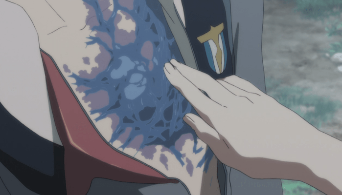 For once we get no robot fights this week, and as a result it’s a pretty lackluster showing. I suppose they’re trying to get us more invested in these characters by giving them more screen time, but their personalities are so one-note it really just serves to reinforce how bad that part of this show is. I don’t care about teen napoleon and his ongoing efforts to make himself completely unlikable. I don’t need that scene in Hiro’s room to know that Hiro is really faking being okay and that milquetoast dude cares for him. Honestly, showing the wound in that scene takes a lot of weight out of the last one when 002 herself touches it. If they’re trying to make parallels to intimacy, it would have also made more sense since the wound is the only real physical manifestation of their intimacy.