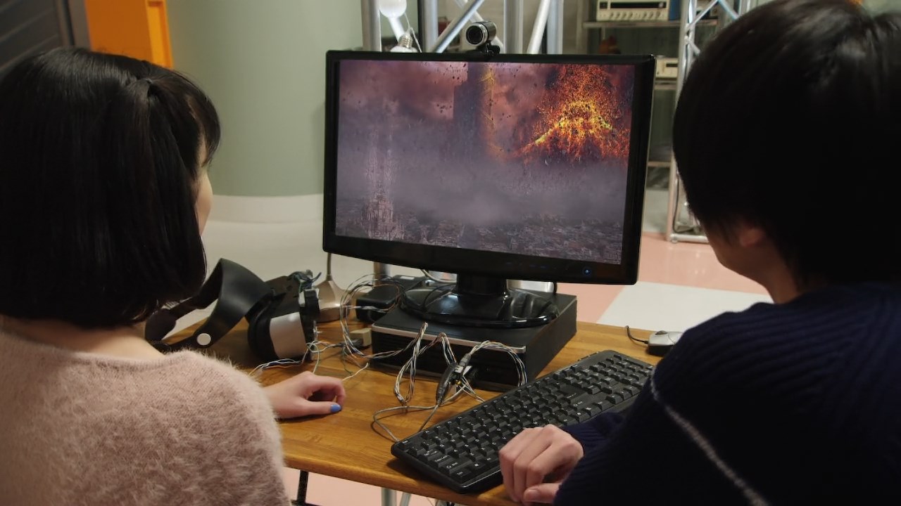 - Sentou’s brain-viewing device is very obviously just a PlayStation VR headset with some wires on the front.