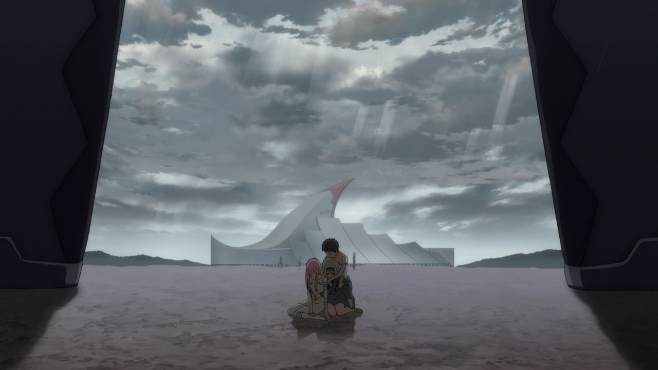 The other major character arc the show attempts to cap off in these two episodes is the Mitsuru/Kokoro relationship, and once again it’s done in the most ham-handed, clumsy way possible. They confirm Kokoro’s pregnancy which disqualifies her from piloting a FRANXX because….actually they never bother to explain that. This means she’s relegated to staying on Earth and Mitsuru decides to stay with her, even though the last time we saw him he was ice-cold towards her. There’s actually the germ of a good idea here – if Mitsuru had had to come to terms with the idea that his past self, a completely different person, had fathered a child and now he was going to have to be responsible for it, that’s an intriguing and potentially provocative story. The problem is, there’s simply no time for that, nor is the show interested in exploring it, so instead we get the two seemingly falling back in love within the span of a few days, culminating in a squirm-inducingly embarrassing confession in the rain scene. The show doesn’t even make it clear if their brainwashing has actually worn off, instead just treating it as a brand new proposal. Even if you buy this frankly ludicrous turn, what then was the point of the brainwashing in the first place, other than do drag out an already badly written and unlikable romantic subplot.