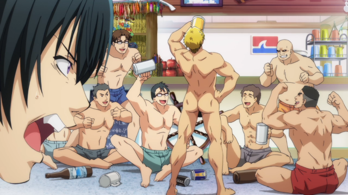 I’m not from America or a guy, and have therefore never been part of a frat. That’s exactly the sort of stereotypical image and feel I get from Grand Blue though – a Japanese version of young, college-age guys getting constantly hammered by the beach and generally behaving the way you’d imagine. I don’t know that I’d call it particularly offensive (while certainly not G-rated, the proceedings are still fairly tame and unimaginative), but it’s nothing but the same one or two jokes over and over as exaggeratedly jacked guys down lots of booze, get naked, and bond over their manly manliness. Meanwhile, the ladies of the show are introduced in one of two ways: from the legs up or the breasts down. They are all pinnacles of beachy, girl-next-door type sexiness (or at least, what the creators think are the pinnacles of beachy, girl-next-door type sexiness), and there’s also scuba diving involved because… it sounded vaguely more interesting that way I guess? In any case, Grand Blue is first and foremost a slightly raunchy comedy, and to me was also as repetitive and banal as it looked as first glance. I honestly stopped paying close attention by the end of the first half of the episode, as I really think it was just pretty boring all-round.