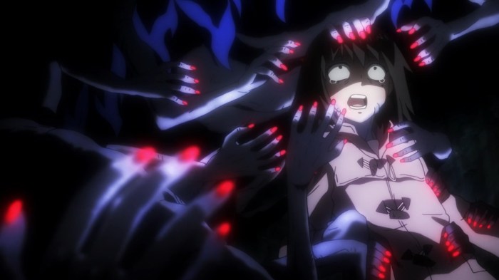 When it comes to depicting the spirits, the show shifts from its kids show aesthetic to something a little more adult, as the show touches on topics such as suicide, murder and revenge. We see a guy getting pulled onto train tracks, we see a girl fall in front of a train with an accompanying splatter effect, and we later see this girl’s monster-like spirit choking out a girl she clearly had a romantic interest in while she was alive. But this tonal shift is massively jarring, as it flits back to its early morning shounen vibe every time the not-human protag uses his book of spells book of law to punish the monster, and then back to more adult tones straight after.