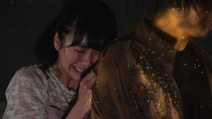 Let’s start with Kazumi’s last stand, which is probably the less effective for the two character deaths here for all sorts of reasons. The main one is simply that…well, Kazumi isn’t really much of a character. Once his initial arc as an antagonist was over he’s basically vacillated between creepy fanboy comic relief, a second obstinate figure for Banjou to bang heads with after Sentou, and a kind of busman who does all the odd jobs and beats up all the excess villains the main characters are too busy for. In that sense I understand why you’d go back to the his relationship with the Three Crows, since it’s the only time his character really had any emotional heft to it at all. Problem is, as I observed in my last post, we have just been going over the Three Crows thing again and again and again and at this point any shred of pathos still left in it has long since been played out. The fight is fine I guess, but it’s mostly just a chance for Kaho Takada to demonstrate again how much better an actor she is than everyone else on the crew. The fact that the show decides it’s worthy of the all-silent mourning sequence afterwards is just tiresome really, and a good signifier of just how far Build’s perception of itself has drifted from the reality of the situation.