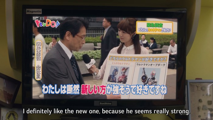 We were talking before we watched this episode that there’d be a super convenient way to justify the media’s shoddy coverage of the events of the show so far, and wouldn’t you know it, Aizen does control the media! His plan, it seems, is to tie himself to his Ultraman without actually admitting it’s him, and he’s going to use his media influence to reinforce that. To sell this idea, he acts as much like a nerdy fan of Black Black Black Black as possible, even down to ‘mimicking’ his heart beam gesture while announcing Aizentech’s support for him.