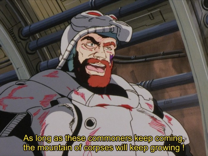 • I guess this is subjective but I don’t think the FPA is short on sympathetic characters, it’s just that there are relatively few sympathetic characters in the position of power. But with the FPA I always felt like the point was a sort of extended navel-gazing about the nature of democracy, how it’s deeply flawed and easily corrupted, but ultimately is worth fighting for, so having only Yang (who is flawed in his own ways and wouldn’t necessarily be regarded as a hero by history!) and a handful of smaller roles around him is kind of the point. With the FPA’s situation being what it is, I think it makes more sense to have characters who aren’t necessarily resisting loudly but try to fight where they can, or just simply low-key continue to believe in democratic values, because that’s kind of how things tend to end up in real life, too. Fighting losing battles usually ends up grinding people down – which is something that I think LoGH does a great job showing.