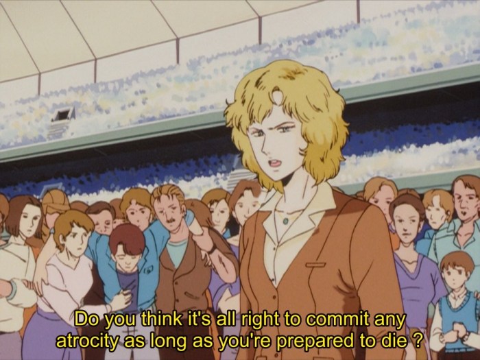 1. While I readily admit that LoGH is not exactly the bleeding edge of progress when it comes to female characters (then again it was the ’80s in Japan) I don’t think Jessica’s death constitutes as fridging… at least going by the definition of “fridging” as having her die to provide motivation for Yang. Yang doesn’t decide to do what he does because of Jessica’s death, he would have done the same if she lived or if she hadn’t even been at the protest in the first place. Her death hits him hard, yes, but it’s not the catalyst of Yang’s actions, or even “a” catalyst. (Er, I hope this is not a spoiler, I don’t really remember where exactly the episode ended. But in any case, the episode makes it clear that Yang’s decision had been made before was informed of her death.)