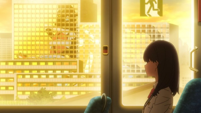 It’s all part of the absolutely outstanding visual storytelling which is the other pillar of this episode’s greatness. The staff at Trigger adopt a looser, more fluid and ‘cartoony’ look for large parts of this episode, which helps with the fever-dream atmosphere, and there’s some incredibly good directing to go with it. Visual flourishes like the very brief glimpses of Gridman in the background, on posters, in reflections etc (which increase in number and decrease in subtlety as the episode goes on) or the contrasting shots of Akane and the Gridman Alliance running in opposite directions, shrunk into the corners of the picture, are incredibly important at conveying emotion and themes more effectively than narrative ever could. There’s some outstanding use of pathetic fallacy here also – contrast the grimy, grey and perpetually raining ‘real’ world with the sunny blue skies of Akane and Yuta’s dream, or notice how Rikka’s starts on a beautiful spring day but gradually darkens until we reach dusk, long shadows and waning light casting over everything.