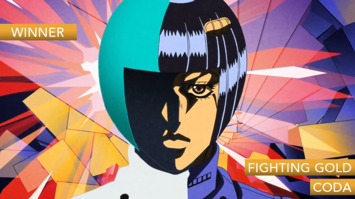 Fighting Gold by Coda marks the glorious return of the Part 2 fan favorite singer as well as our introduction to Golden Wind. While the show itself has yet to win me over as easily as Diamond is Unbreakable, there’s no denying its OP has a ton of style, both in its song and its fantastic art direction.