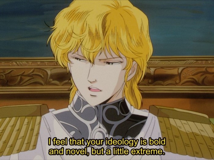 One of the neat parts that the series did is to not draw attention to stuff low key happening on scene. When Reinhard was sick and a doctor was checking up on him his personal guard had his gun drawn and was hiding it behind his back just waiting for any sign from the doctor trying to pull something. The most obvious one though was when Reinhard refused to retreat his assistant guy and the same head bodyguard looked at each other and nodded and attempted to manhandle Reinhard into escaping.