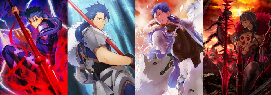 The many versions of Cú Chulainn in Fate/Grand Order. Left to right: Lancer, “Prototype”, Caster, Berserker