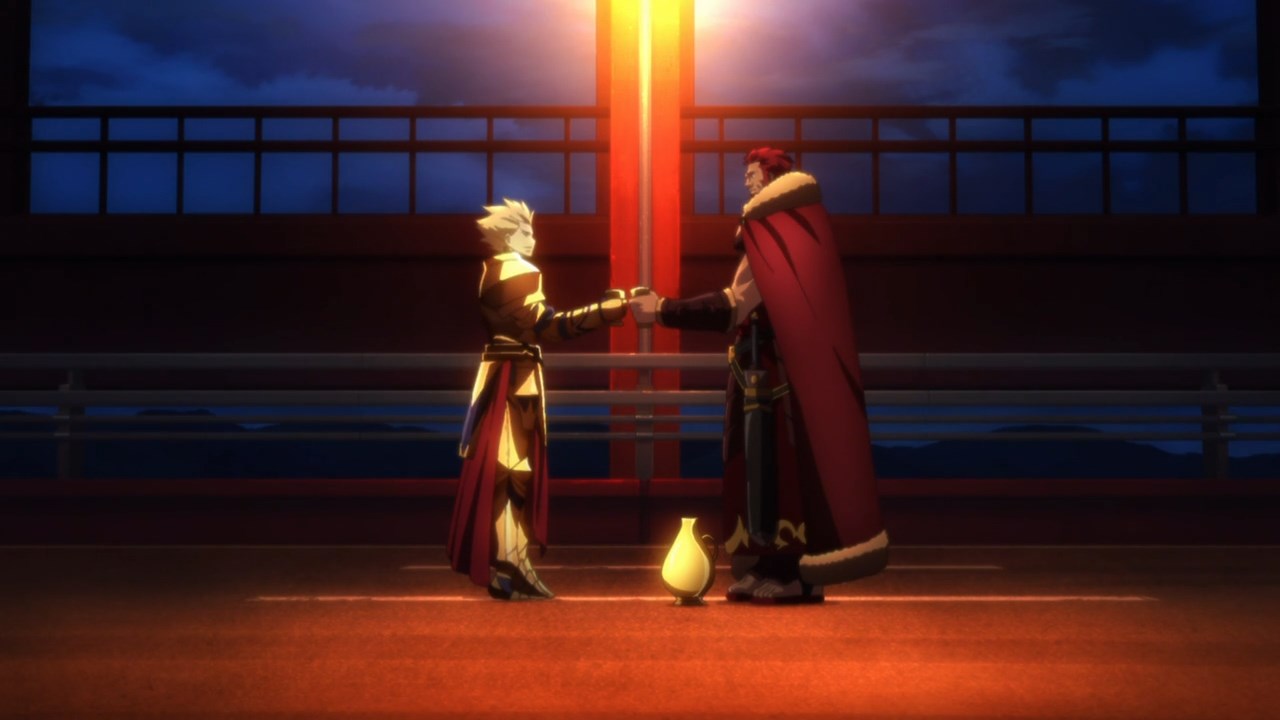 All along the show has built these two up as polar opposites – the vain, disinterested and aloof Gilgamesh versus the hearty, boisterous man-of-the people Iskander. Yet when they meet, it’s not clashing of two opposite egos we expect, but instead a quiet, almost reverent show of respect between two warriors who probably already know the outcome of the battle that’s about to happen, but are driven to see it through to the end. In a story defined by backstabbings and betrayals, double-crosses and sneak attacks, the confrontation between its greatest villain and greatest hero has a pathos that can’t be matched.