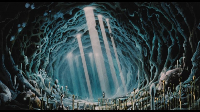 The name Nausicaä, however, is a double-edged sword. It stands for purity and motherhood, but as a result — at least in the case of Homer’s Nausicaä — for the virtues to be upheld by women at the time as well. A big tree attracts the woodsman’s axe, as they say, so it’s no surprise that some critics see Miyazaki’s Nausicaä, clad in baby blue and graced with the dulcet voice of Sumi Shimamoto, not as a genuinely empowered heroine, but as little more than the manifestation of Miyazaki’s obsession with innocence, her flawlessness not serving to applaud her convictions, but to set an impossible and ultimately rather traditionally feminine ideal actual girls and women can’t ever hope to achieve. I personally disagree, but it does merit some thought — isn’t it true that Nausicaä’s design and portrayal, especially when compared to her “shadow” Kushana, affirms, rather than averts, the traits straight men find attractive in girls? Gosh, let’s not even mention the can of worms that is Kushana’s whole existence in this film essentially equating humanity with the possession of an abled, flesh-and-bone body. Ugh. Let’s be honest. I’m not going to fault an almost forty years old movie for adhering to the most basic of basic storytelling conventions. Yet the fact that I’m even considering picking this nit honestly only speaks to its strengths.