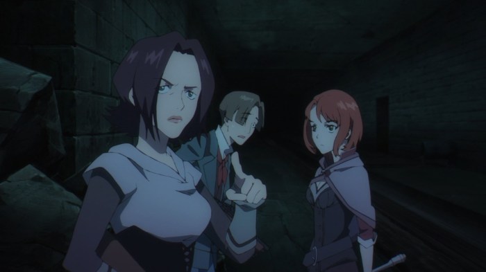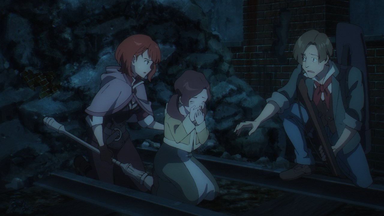 The show drops a bit more worldbuilding on us this week with the well-worn fantasy anime chestnuts of “Coldfire” (read: weird glowy planet juice) and “Luminosis” (read: illness caused by exposure to weird glowy planet juice). It lends more credence to Innumael and the Headkeepers being the protagonists, as the person afflicted with luminosis is one of their sympathizers. They’re clearly committed to the cause, too: a random local woman is one thing, but the implication of her own terminally-ill daughter also knowing all of the sewer routes is surprisingly grim.