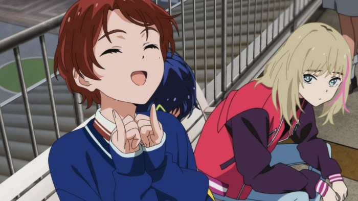 What’s particularly clever is that this only makes sense once you’ve seen the ending of the episode, which is expertly shot and framed to look like an classic cliched imminent confession of love. We’re meant to believe Ai’s powerup came from finally accepting her feelings and making peace with her crush on Sawaki. Except that makes absolutely no sense thematically, and so the swerve at the end is very welcome and clearly deliberate. It does raise the question of why Ai felt the need to run through the pouring rain to tell Sawaki to his face that she’s coming back to school, but maybe it was a spontaneous expression of triumph and an ‘in your face!’ moment so to speak. Regardless, I’m pleased that the episode was able to tackle the doubts and conflicts of our heroine in such a well-plotted way, and it’s another sign of Wonder Egg carefully tiptoeing its way through a potential minefield…just…and delivering some keen commentary on happenings both inside and outside of the story.