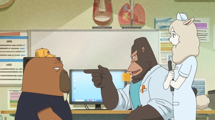 This wasn’t at all what I expected from seeing a handful of preview images. Far from being some kind of funny animal gag comedy or something, Odd Taxi is a slow burn of intrigue and character conflict centered around our washed-up, middle-aged, walrus-man protagonist. The premiere sets up an impressive number of plot threads: there’s a teenage runaway who might be hiding in Walrus’s house, a baboon criminal on the loose, an alpaca nurse smuggling meds from her employer, a corrupt cop, a popular new debut idol, and several characters who are all related to these threads if not directly involved. Color me interested.