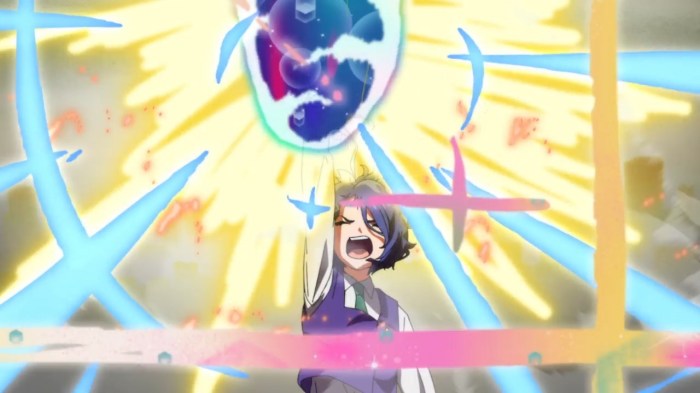 The other way the show makes explicit a connection between the two Ais is to increasingly visually conflate them, a classic technique of surrealist cinema. They start out as two very distinct entities, easily told apart by their differing manners of dress. But once ‘our’ Ai is put into a matching school uniform the show increasingly plays fast and loose with which version of the character it is we’re seeing. This deliberate confusion over the identity of the character is mirrored thematically, as ‘our’ Ai deals with her own feelings of unhappiness and desire to take her life, before the two versions of the character come together to reject those feelings and the false Sawaki who represents them. The ultimate culmination of this is in the episode-ending showdown, where it’s very clearly ‘our’ Ai who takes the killing blow, but she’s suddenly replaced by her alternate self instead. There’s no rational explanation for this, but it makes sense in abstract – Ai2 has been so inspired by the vision of what ‘she’ was able to become that she gave up her own existence so that her stronger, happier self would be able to continue on. It works as an emotional climax rather than a logical or mechanical one, which is clearly the point.