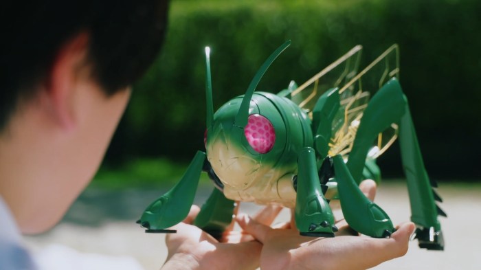 Production-wise we’ve got a similarly mixed bag. I generally like the Gotchard suit (although I worry how well that shiny finish is going to hold up) and our first monster costume is genuinely cool, with the bound ‘human’ arms being a great visual flourish. On the other hand we’ve still got a bevy of unnecessary CGI, with the brief grasshopper transformation standing out as both ugly and completely pointless. A more serious concern comes in the opening moments of the fight, which features a drop in video quality so astonishing I’d be ashamed of putting it in a home movie…on VHS. For a few years now Rider and Sentai shows have very clearly been using off-the-shelf commercial drones for some of their more kinetic shots, and the resulting loss of quality has always been easy to notice, but this is a truly staggering example that I’m pretty astonished was deemed OK for broadcast, and suggests some pretty serious time pressures on this episode.