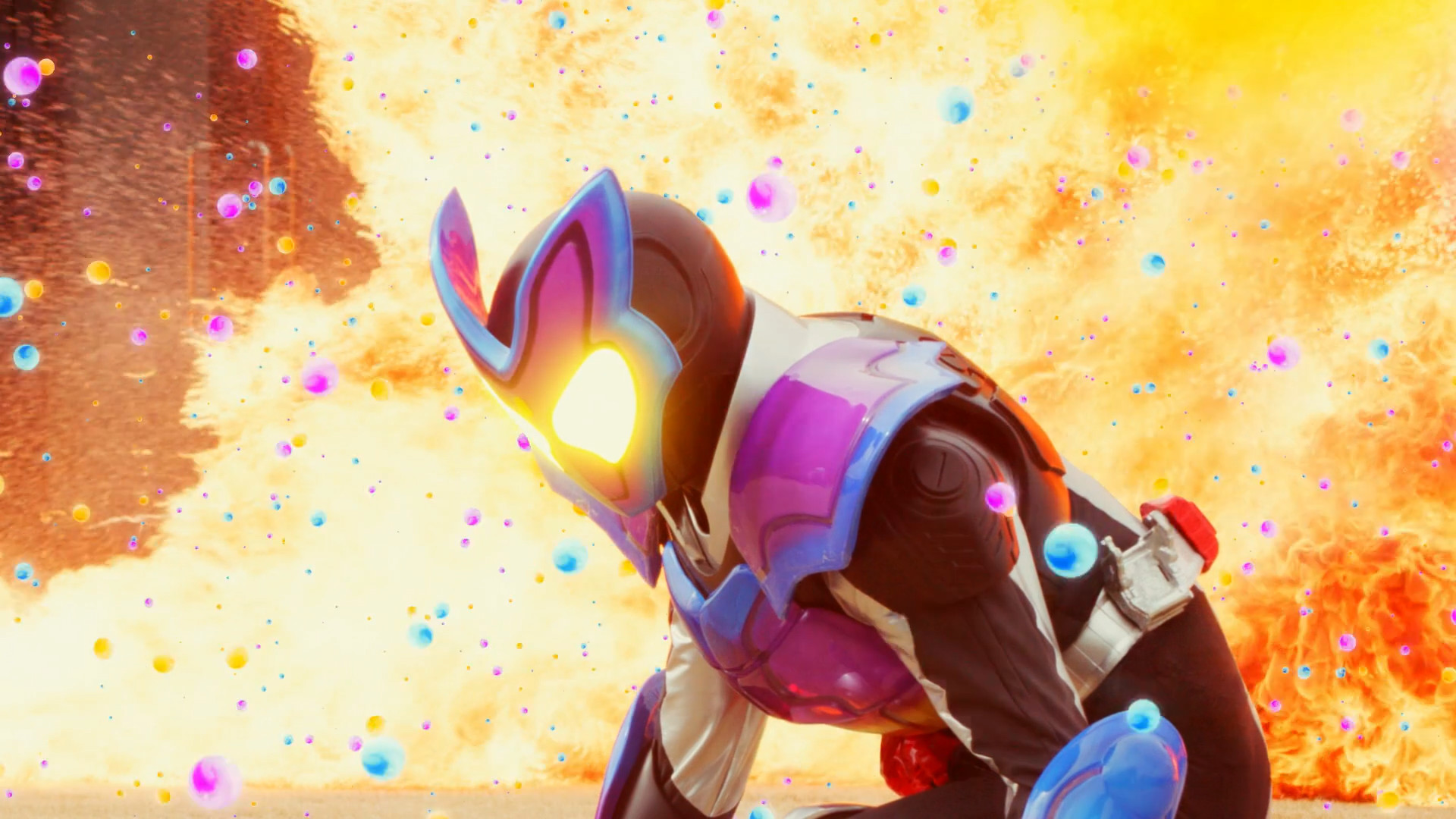 So far, so good right? Well, here’s where things get a little subjective. Look, a snacks themed Kamen Rider makes all the sense in the world – the show has always been a catalogue of the most marketable obsessions of pre-teen boys – but did it have to be so…kind of gross? And it’s not even the boisterously marketable Ren & Stimpy style of gross, it’s just a lot of mouth and tongue imagery but presented in modern Kamen Rider‘s very clean, sterile aesthetic. The mismatch is palpable and teeters on the edge of outright self-parody. You might argue dinging a show purely for design aesthetics is kind of shallow, and I’ll agree with you on some level, but also television is a visual medium and tokusatsu television especially so. Gavv isn’t as off-putting as my personal white whale Kamen Rider Ex-Aid but it’s still kind of uncomfortable to look at, and I already despise Shoma’s insane stripper-windbreaker combo with tear-away stomach covering. There are more mundane issues too – we’re back to belts which just cannot stop talking and there’s the usual generous slathering of horrible CGI, especially in the back half of the episode.
