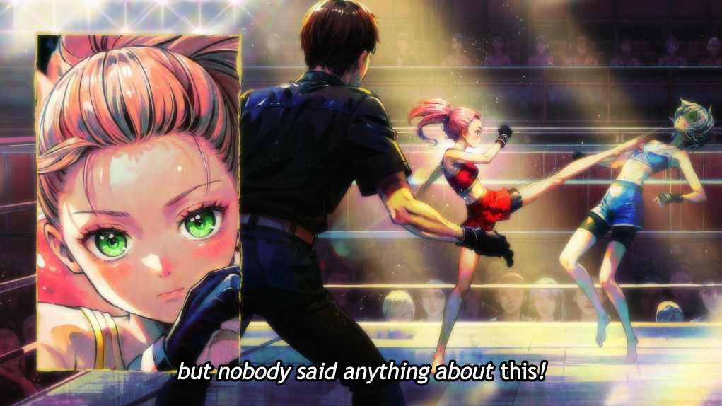 I guess it’s ironic that this show is about a rich asshole who hates humans and only trusts technology, but here we are. Several suspicious “illustrations” are used in lieu of actually animating the fight scenes, as well as a sort of Ashita no Joe dramatic effect when the narrator is speaking. Here’s the first example, which looks to me like they literally took the screenshot and told the AI to make it look like an anime painting: