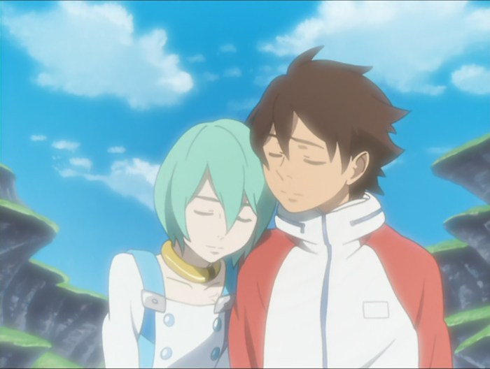 Returning to a show after an extended time away is always interesting of course, but this show, this time period, and returning in this way is especially fascinating. When I first watched Eureka Seven I was 21 years old, and at that age I was obviously drawn more to the show’s surface level aspects – the big, operatic story of love at first sight, the extremely on-the-nose environmentalism, and the abundance of extraordinary robot battles. That’s not a bad thing – those elements are the things which made me fall in love with the show originally, and remain among my defining memories, but it’s also a lot of fun to go back and notice some of the more nuanced undercurrents in the writing; Holland’s journey from nihilism to a more mature, if still bitter, form of self-reflection, or the recurring themes of fatherhood and role models that are dotted throughout the narrative, or the sneaky evolution of Maurice as an actual, fully rounded character just in time to make him part of the narrative at the most dramatic possible moment. Part of the joy of a detailed rewatch is picking up on these slightly less obvious threads and seeing how they enrich the main narrative of the show.