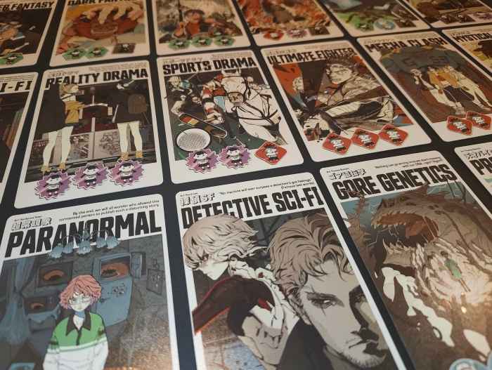 Enough about spending money, though. How do you make it? By releasing high-quality anime, of course! To put your studio’s latest masterpiece out there — which you can only do at the end of each of the game’s four rounds — you’ll first need to gather the three parts that will make up your script. These are adorable little cardboard tiles describing either a setting (e.g. “cyberpunk megacity” or, of course, “high school”), a general plot (e.g. “an alien ship crashes on earth” or “the lone survivor of a massacre seeks power to defend the weak”) or a unique twist on a formula (e.g. “the prophecy was heavily misinterpreted” or “a cult is secretly manipulating their lives”), which players can acquire through game actions carried out by writer tokens. While the text on these script parts is mostly there for flavour, the colour of these tiles does matter. There are five in total, each representing the conventions of action, fantasy, sci-fi, horror and slice-of-life anime, and a player who manages to assemble a full script out of parts in the colours matching those on one of the three currently active, gorgeously illustrated “trend cards” (e.g. two parts action, one part fantasy for an “isekai power fantasy”) will be rewarded far more exuberantly than a player who insists on putting out a sports drama in an industry where supernatural rom-coms are all the rage.